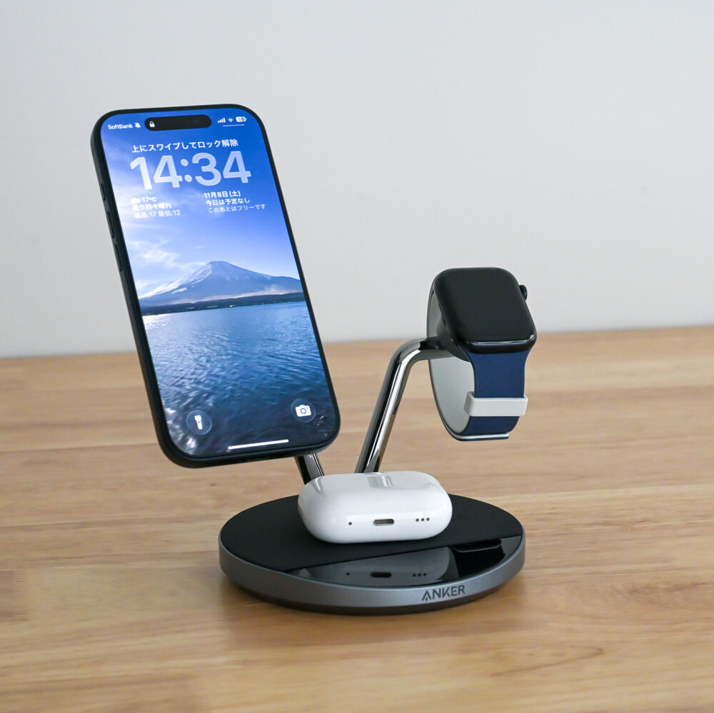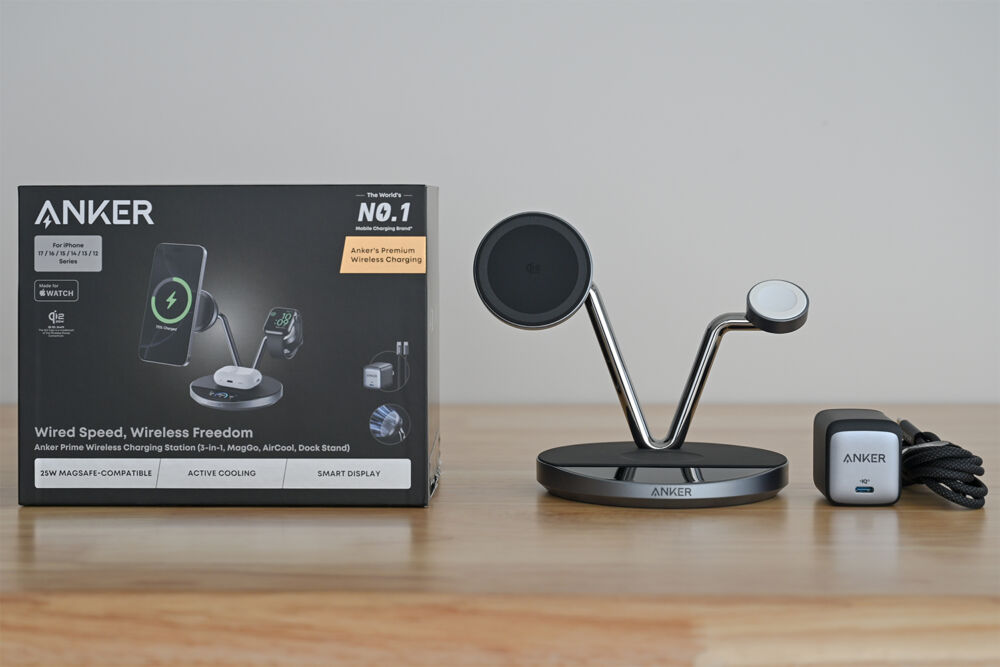 Anker Prime Wireless Charging Station(3-in-1, MagGo, AirCool, Dock Stand)は、Qi2 25W対応スマホとQi対応イヤホン・Apple Watchを3台同時充電できるワイヤレス充電ステーションです。