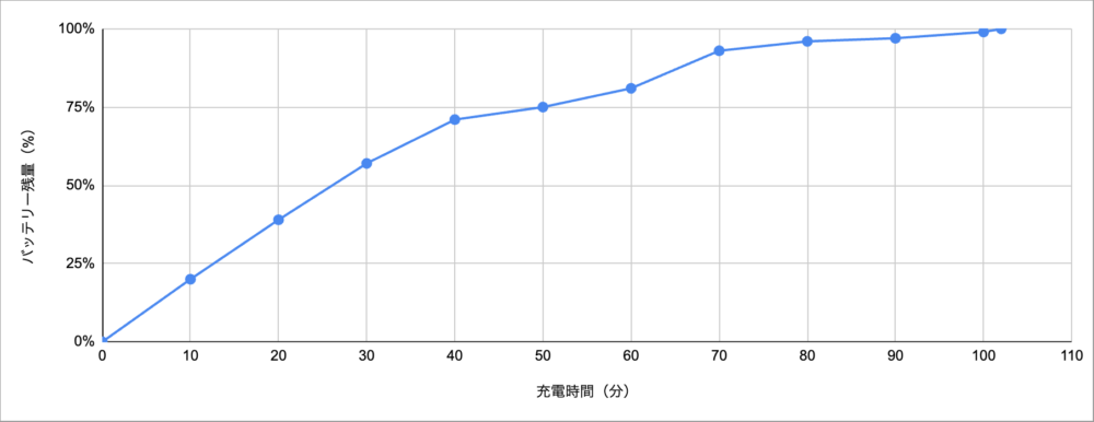 フル充電までの時間も102分とそこそこ速く、温度上昇を防ぎつつも充電速度への影響をかぎりなく抑えるアンカーの技術力の高さを感じました。