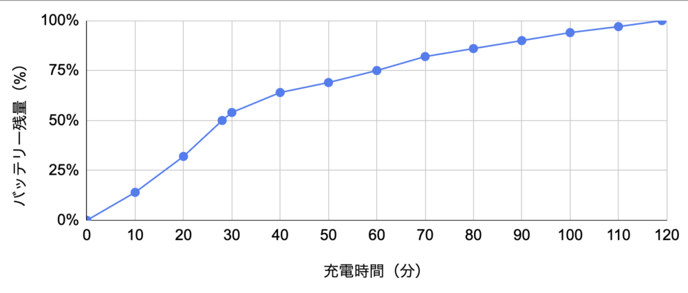 ピーク後はゆるやかになり、満充電までは119分と標準的なペースに落ち着きます。