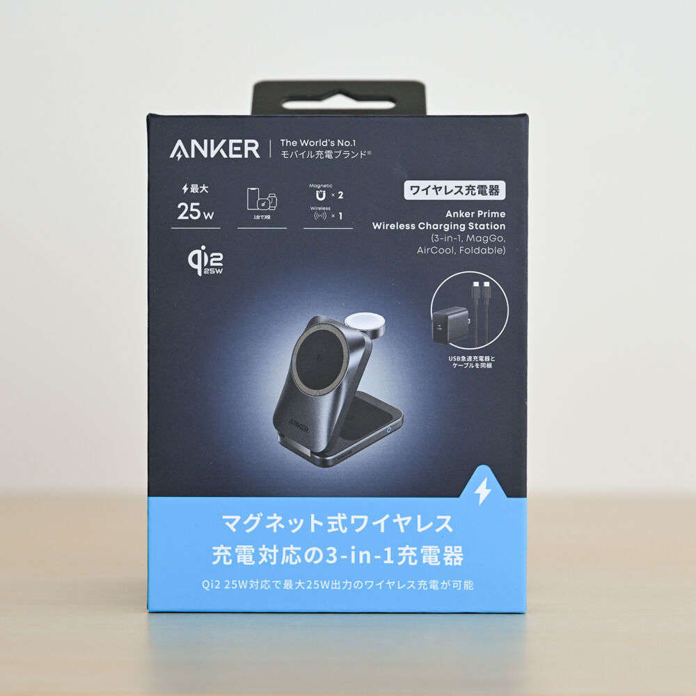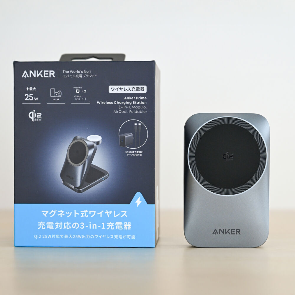 Anker Prime Wireless Charging Station (3-in-1, MagGo, AirCool, Foldable)は、Qi2 25W対応スマホとQi対応イヤホン・Apple Watchを3台同時充電できるワイヤレス充電器です。