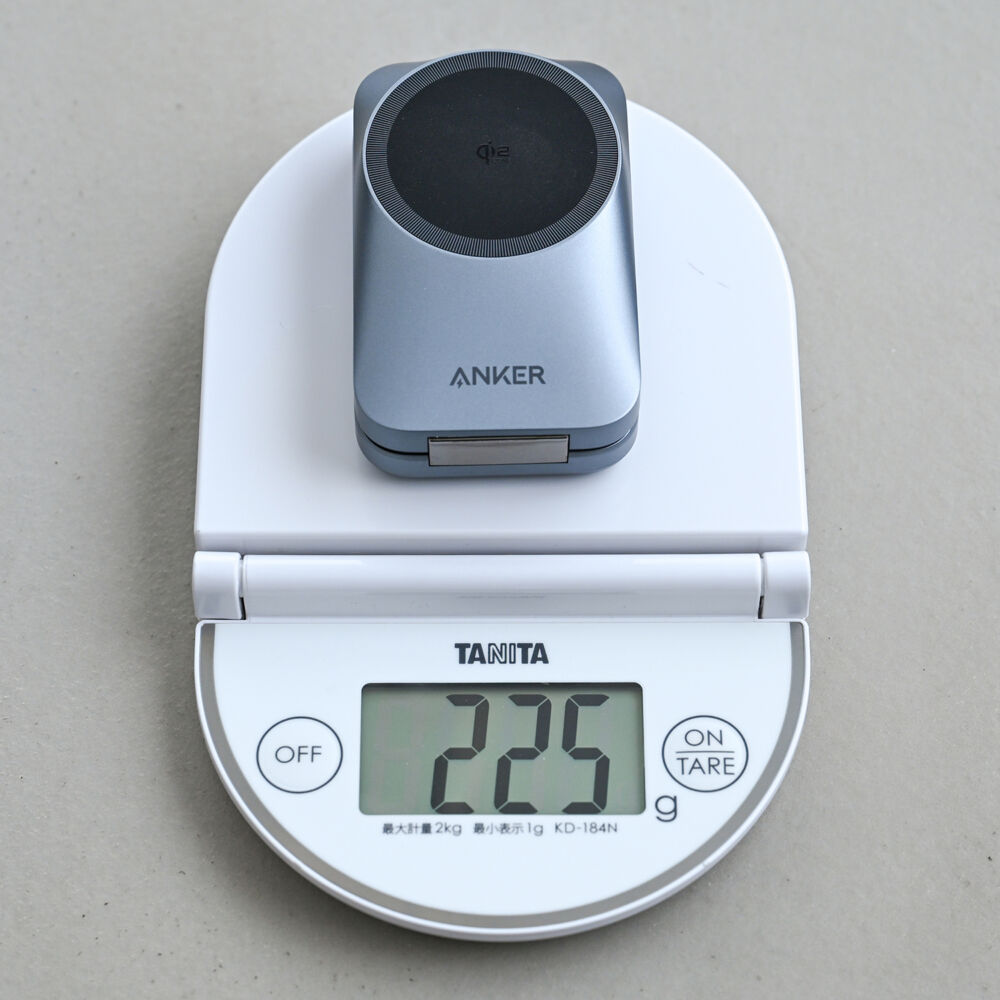 重量は225gで、折りたたみ式のQi2 25Wとしてはやや重めですが、許容範囲内。