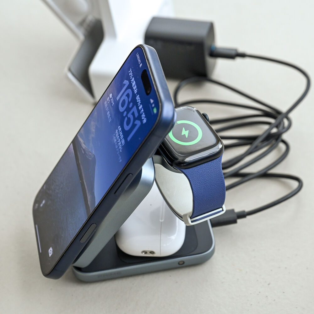 3-in-1タイプの強みは、なんといってもスマホ・Apple Watch・ワイヤレスイヤホンの3台同時充電。