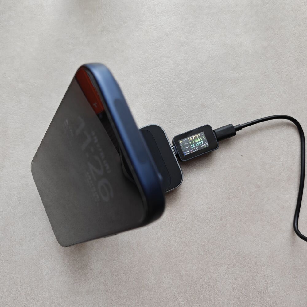 iPhone 17 Pro充電時、テスター読みで最大28.5Wもの出力を確認。