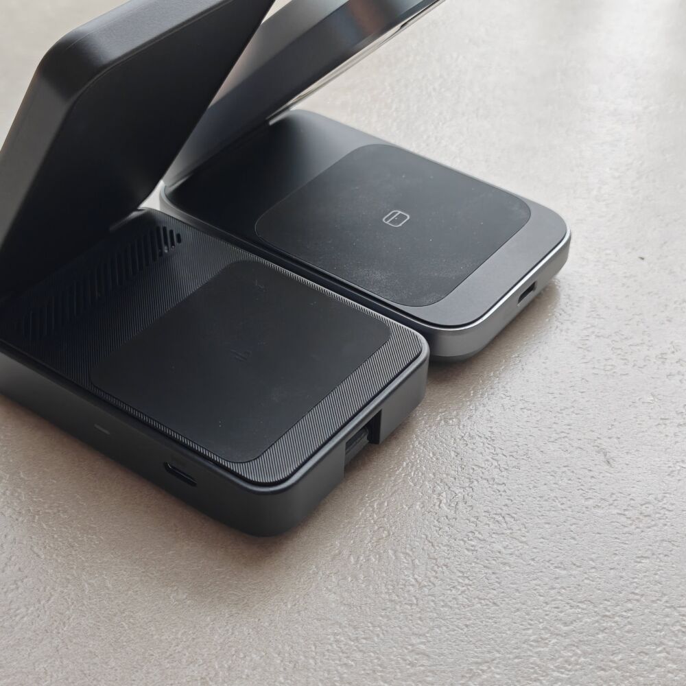 Qi2版のAnker MagGo Wireless Charging Station (Foldable 3-in-1)よりはややボテッとしてますが、冷却ファン内蔵にしては健闘しています。