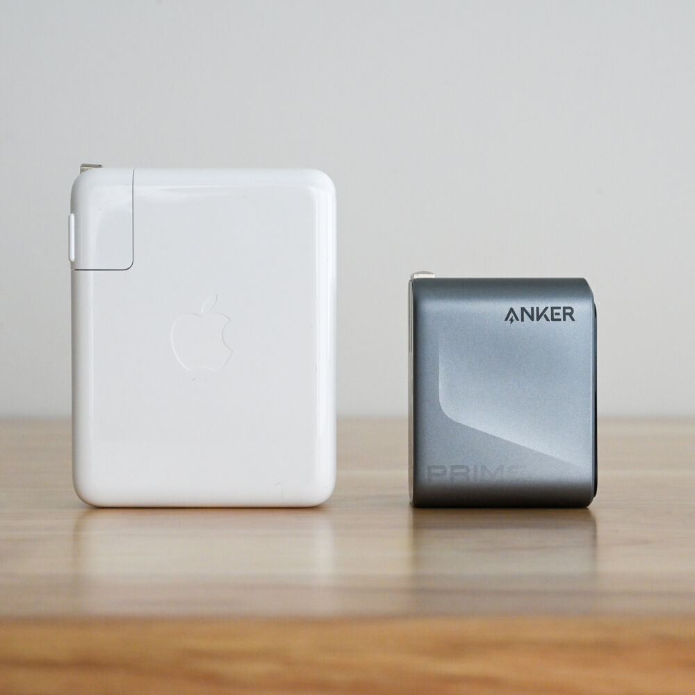 同クラスのApple 140W USB-C電源アダプタと並べるとなんと半分未満。コンパクトですよね。