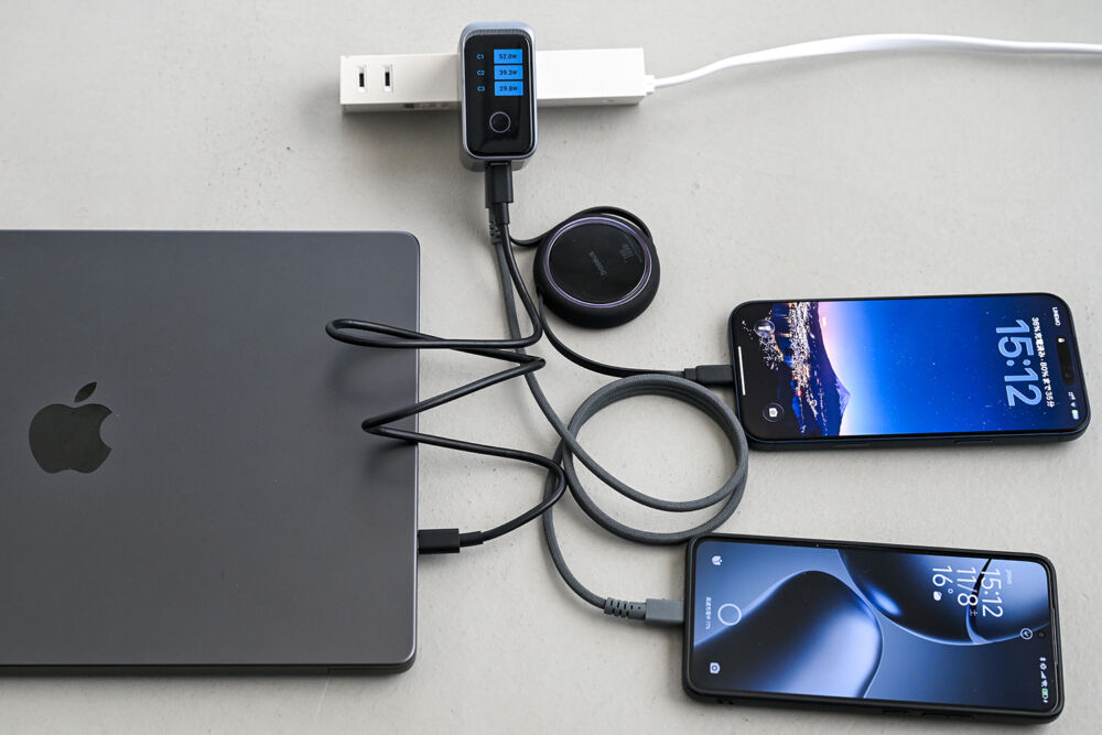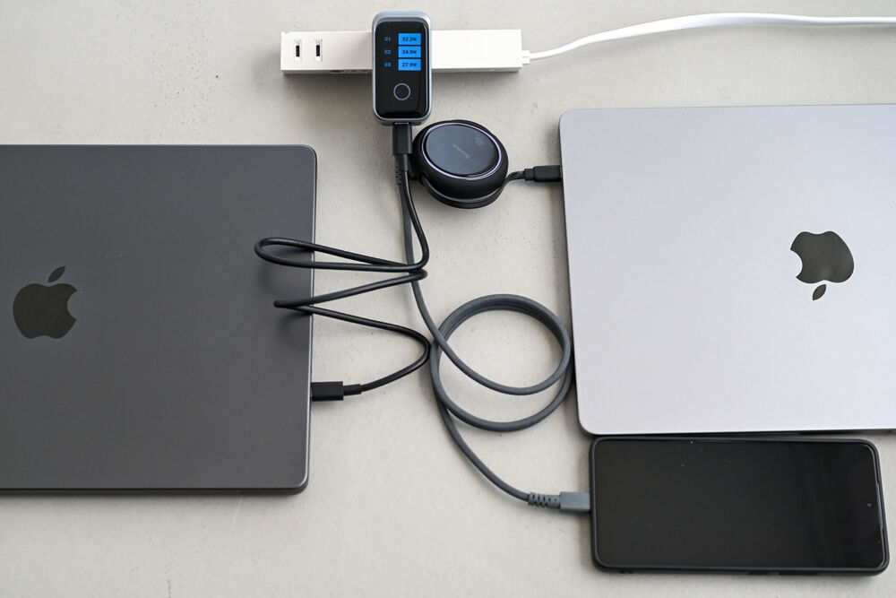 USB-C1を起点に2ポート接続した際は140W(C1)と100W(C2 or C3)に分配され、16インチMacBook Proすら2台同時急速充電が可能です。