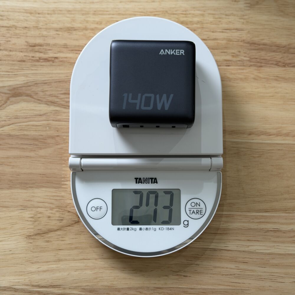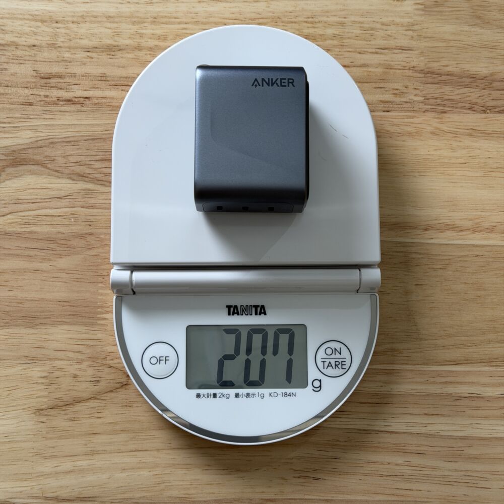 重量は約197gと100WのAnker 736 Chargerよりなんと軽く、96W純正アダプターより100g程度軽量化しています。