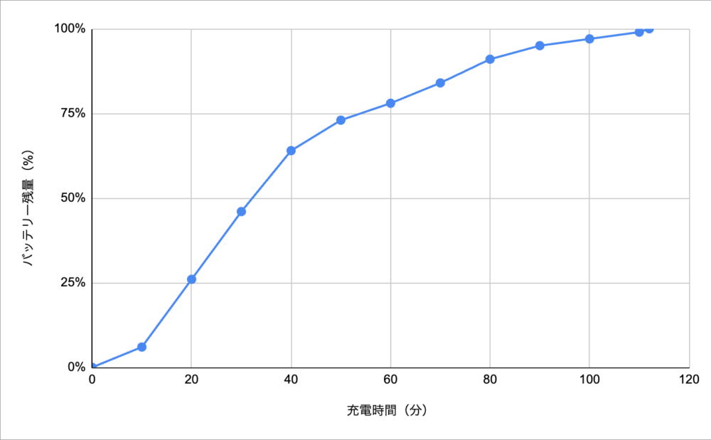 カラからフル充電までに要する時間も計測してみたところ、「112分(1時間42分)」で到達しました。2時間を切ってきました!