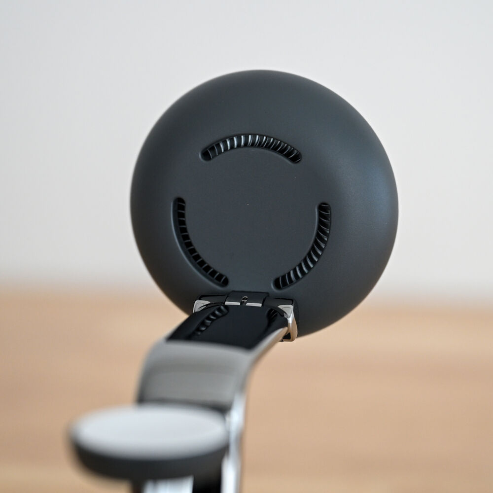 一見して感じるのが造りのよさ。前面にあるスマホ充電用のソフトパッドと、台座部をつなぐメタルアームは、まるで高級車のような品を感じさせます。