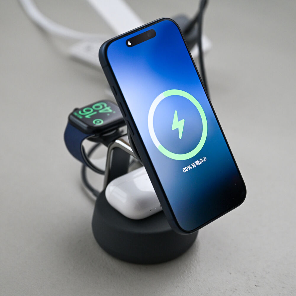 BelkinのQi2 25W Magnetic Charging Dockは、Qi2 25W対応スマホとQi対応イヤホン・Apple Watchを3台同時充電できるワイヤレス充電スタンドです。