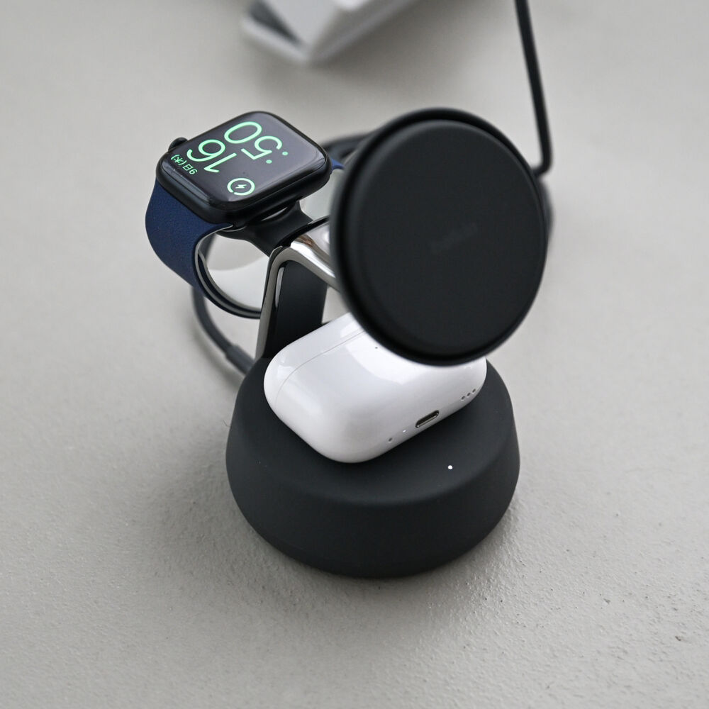 反対面にはApple Watch用の磁気充電パッド、台座部はイヤホン用の充電パッドとなっています。