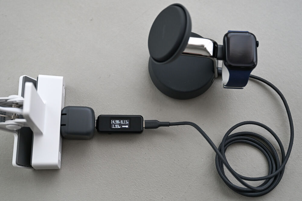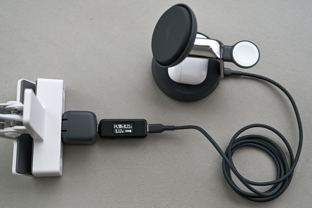 スマホ・イヤホン・Apple Watchの3台同時充電時も、それぞれの機器で出せる最大出力で充電でき、3-in-1としてのトータル出力も問題なし。