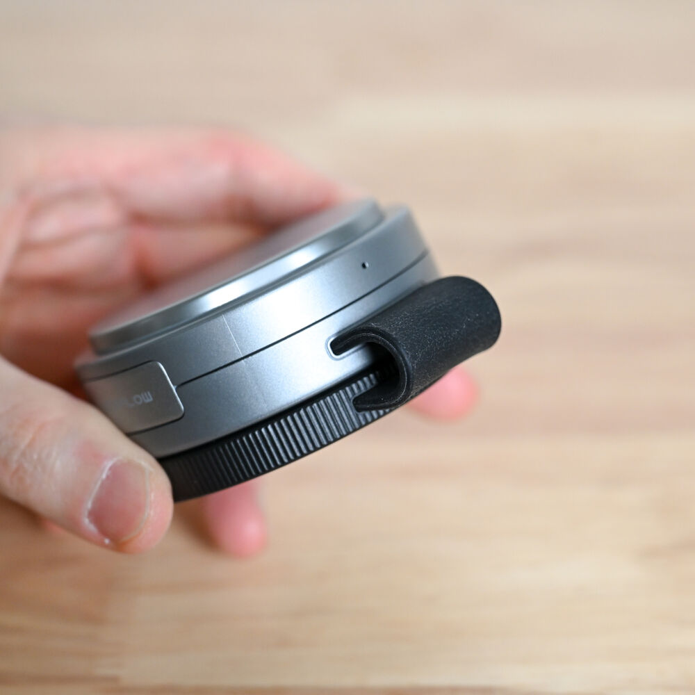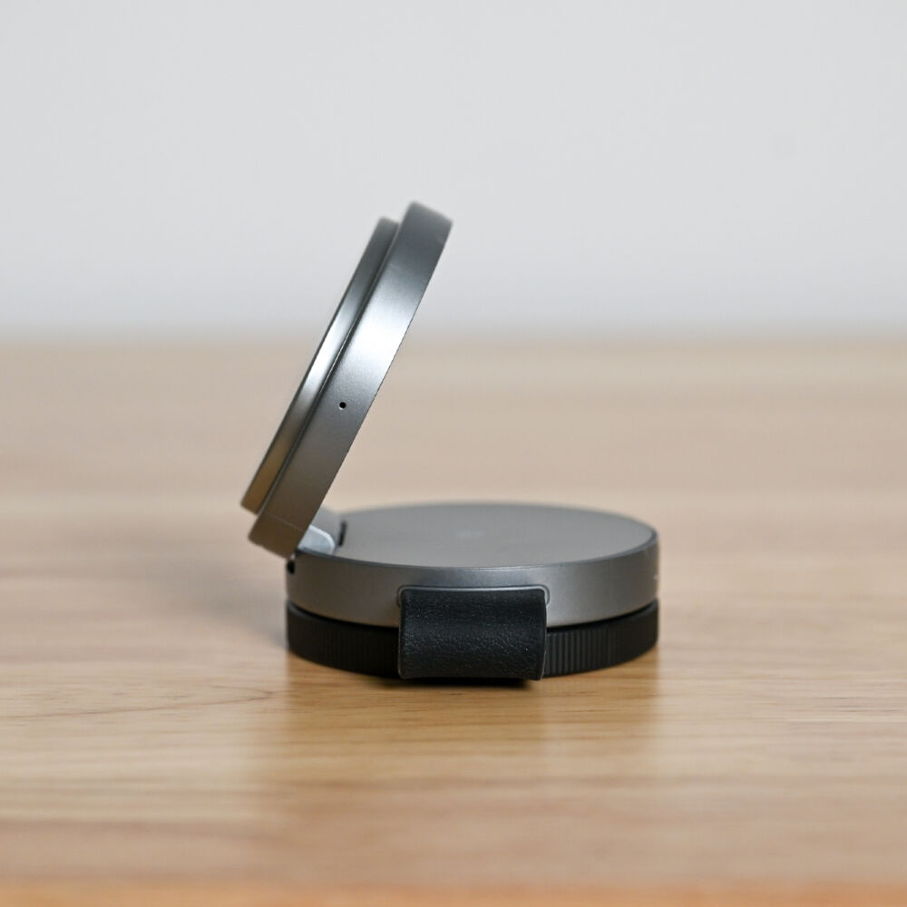 底面の黒いレンズカバーのようなパーツは、マグネットでくっついていて横に展開でき、これがなんとApple Watch用の磁気充電パッド。