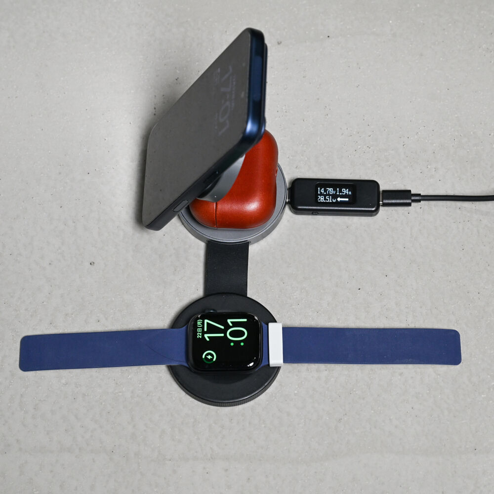 - Qi2 25W対応スマホ・Qi対応イヤホン・Apple Watchの同時充電可能