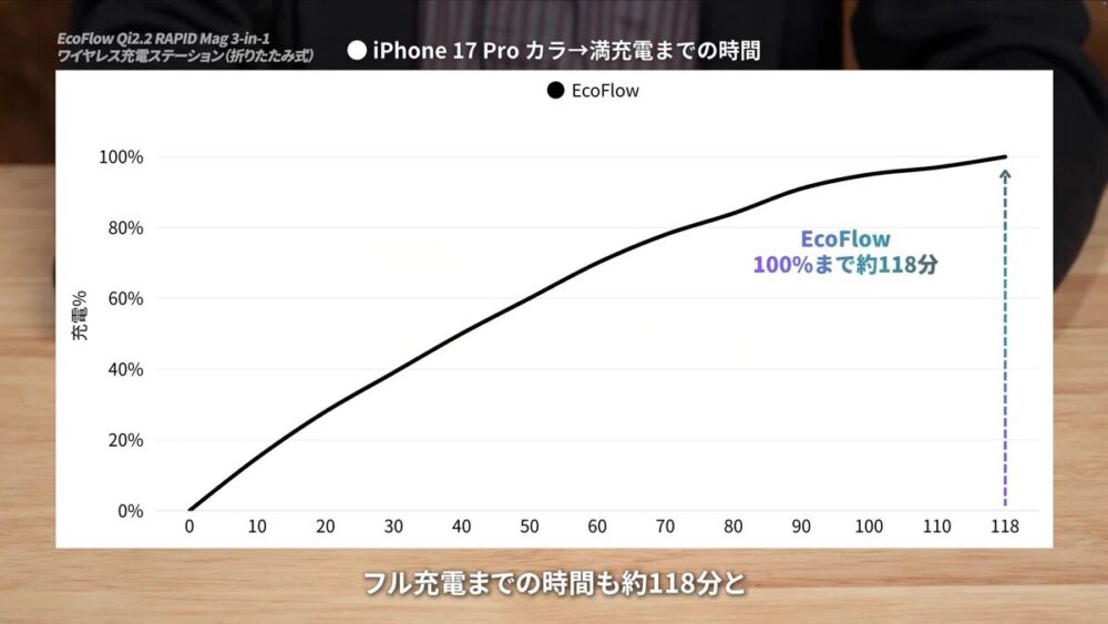 ファンレスモデルなのもあり、充電速度自体はそこそこで、カラからフル充電まで約118分(1時間58分)でした。