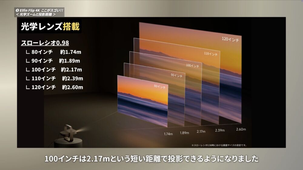 投射比は0.98〜1.3:1で、100インチ投影には2.17mの距離が目安。デジタルズームとちがい、画質劣化がないのが大きな利点です。