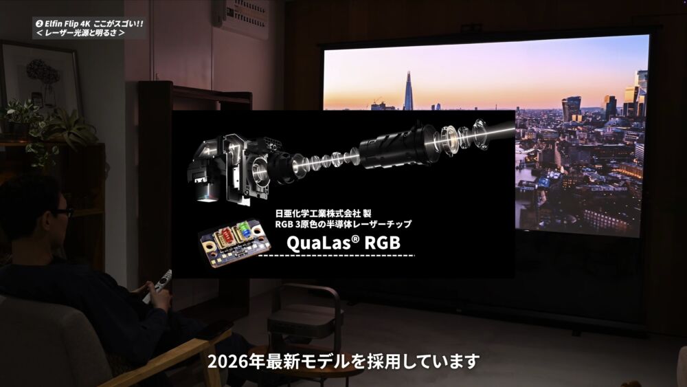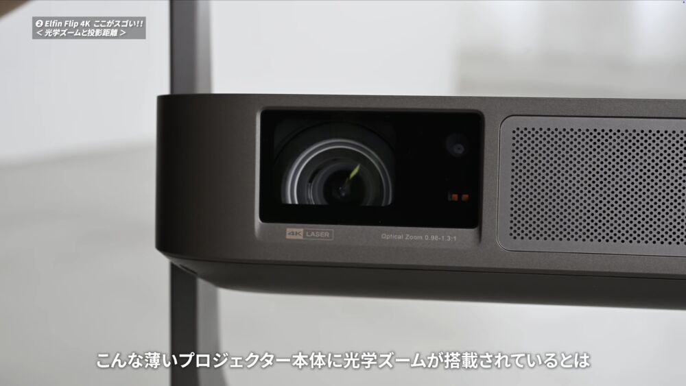 Elfinシリーズは超薄型・天井投影対応のモバイルプロジェクターとして人気ですが、本機は「4K UHD・3色RGBレーザー・光学ズーム・ゲーミング対応」と、Elfin Flip Proから一気に進化。