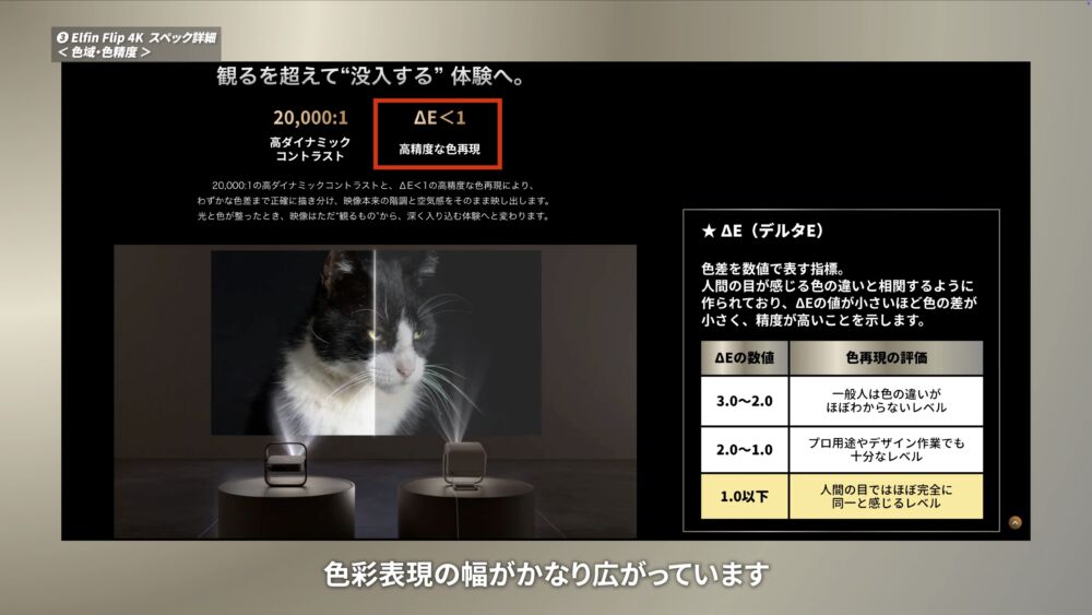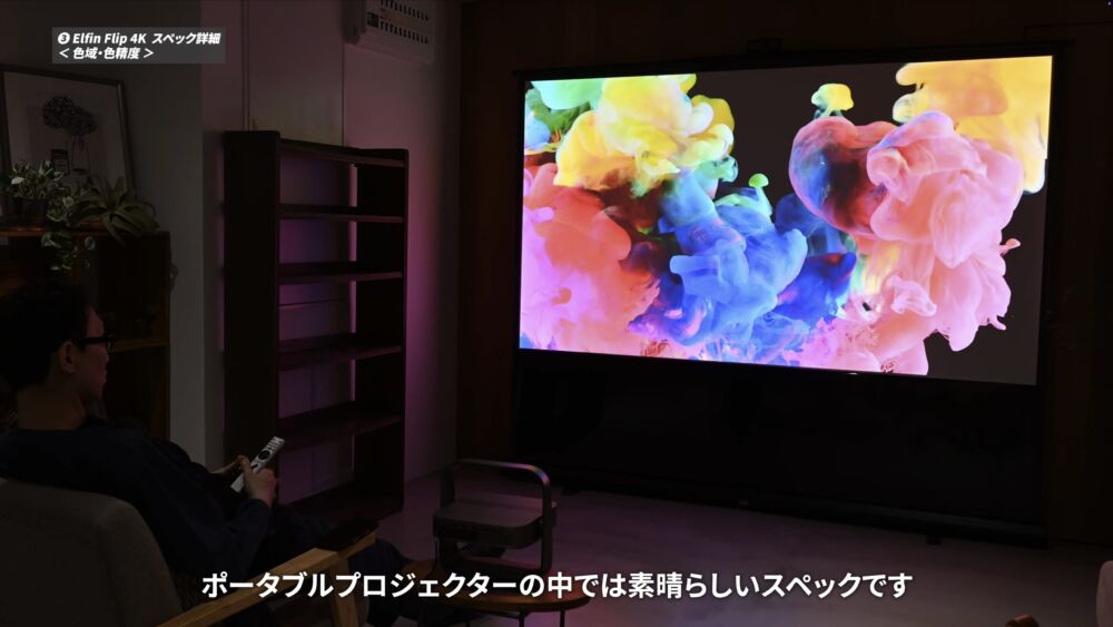 色域はBT.2020を110%カバー、色精度はΔE<1と、据え置きハイエンド機に並ぶスペックを実現しています。 実際に白いスクリーンへ投影してみると、LEDを搭載したElfin Flip Proとは明らかに違う発色。とくに赤と緑の鮮やかさがダンチです。