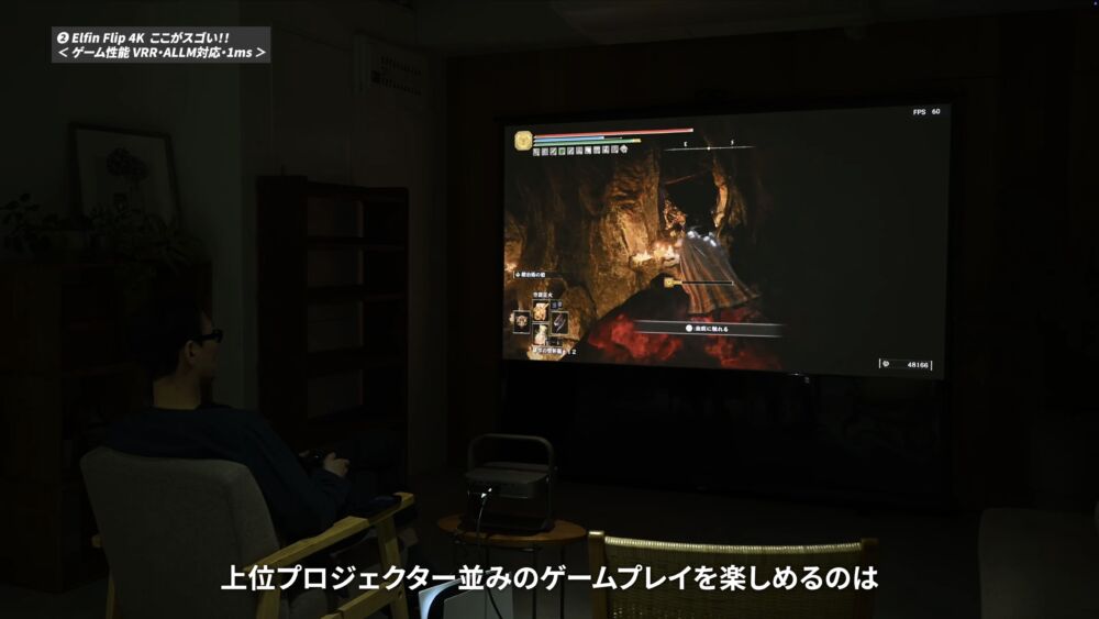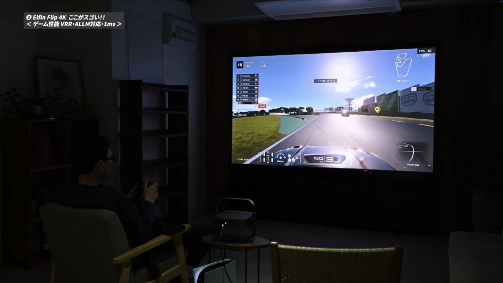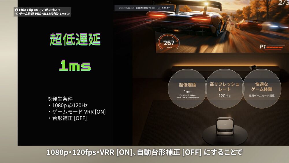 Elfin Flip 4Kは、低遅延ゲームモードでVRR(可変リフレッシュレート)とALLM(オートローレイテンシーモード)に対応し、1080p・120FPS・VRR ON + 自動台形補正OFFの条件で1msの応答速度を実現します。
