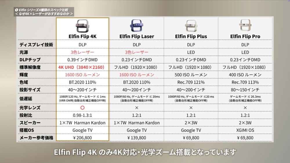 現行のElfinシリーズ4機種を並べると、Elfin Flip 4Kの立ち位置がよくわかります。