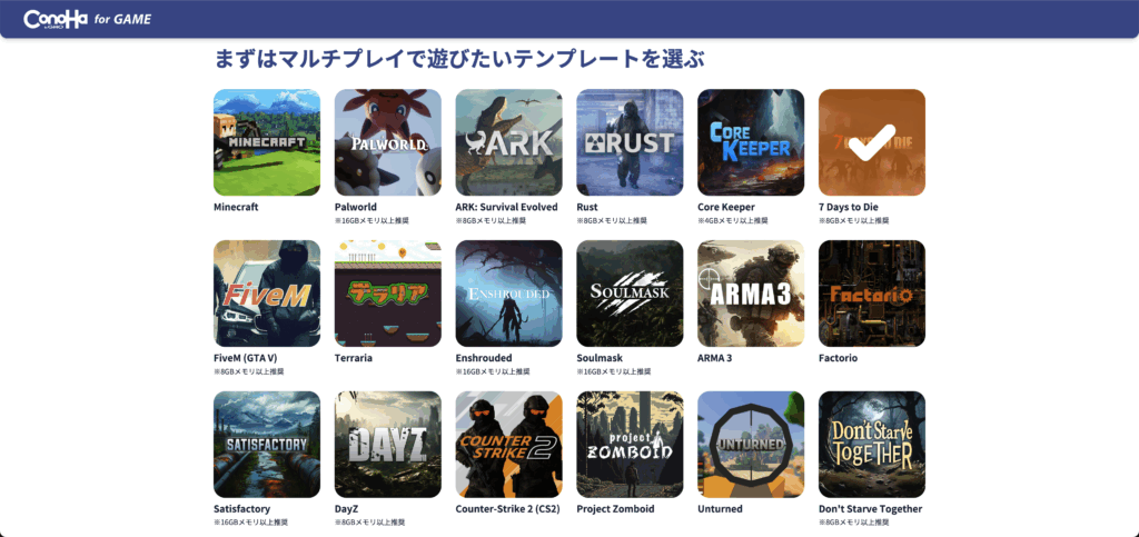 マインクラフトやARK・Rustなど、プレイ層の幅が広くて人口の多いゲームタイトルなら、テンプレート機能が用意されていることが多いです。