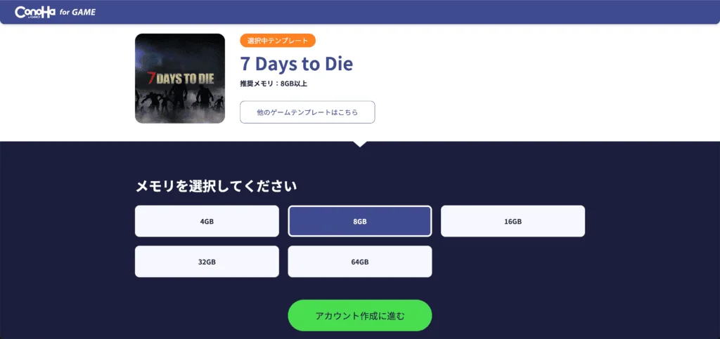 その点ConoHa for GAMEでは、7DTD用のテンプレートが用意されているので、細かい設定などを行う必要がなく、だれでもサーバーを立てられます。