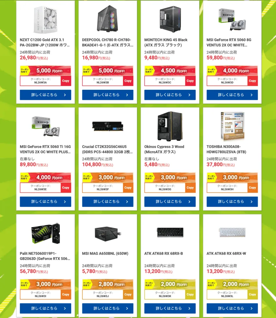 「NL26W3(末尾はA〜Xのいずれか)」のクーポンコードを入れると、対象PCパーツや周辺機器が安くなる、というものです!