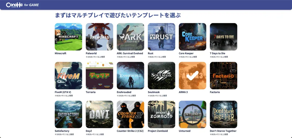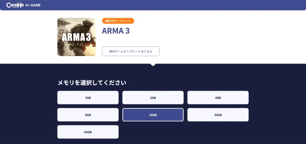 その点ゲームサーバーに特化した「ConoHa for Game」であれば、Arma3のマルチサーバー用テンプレートが用意されているので、特別な知識不要でサーバーを構築可能です。