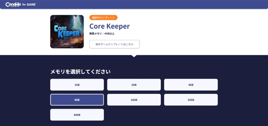 Core Keeperは1GBのプランから対応していますが、「ConoHa for GAME」の推奨は4GB以上のプランです。