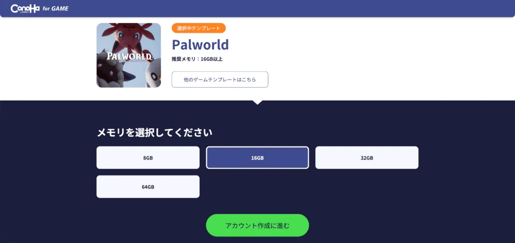 パルワールドは時間課金制のみの専用のプランが用意され、8GB・16GB・32GB・64GBの中から選べます。