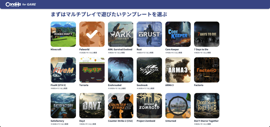 その点ゲームサーバーに特化した「ConoHa for GAME」や「Xserver for Game」であれば、パルワールドのマルチサーバー用テンプレートが用意されているので、特別な知識不要でサーバーを構築できます。