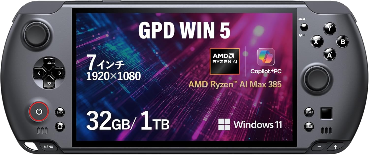 | GPD WIN5 | ハイパワーモデル | Ryzen AI Max 385 | Radeon 8060S | 32GB | 1TB | 7型 120Hz FHD液晶 | 263,000円〜 |