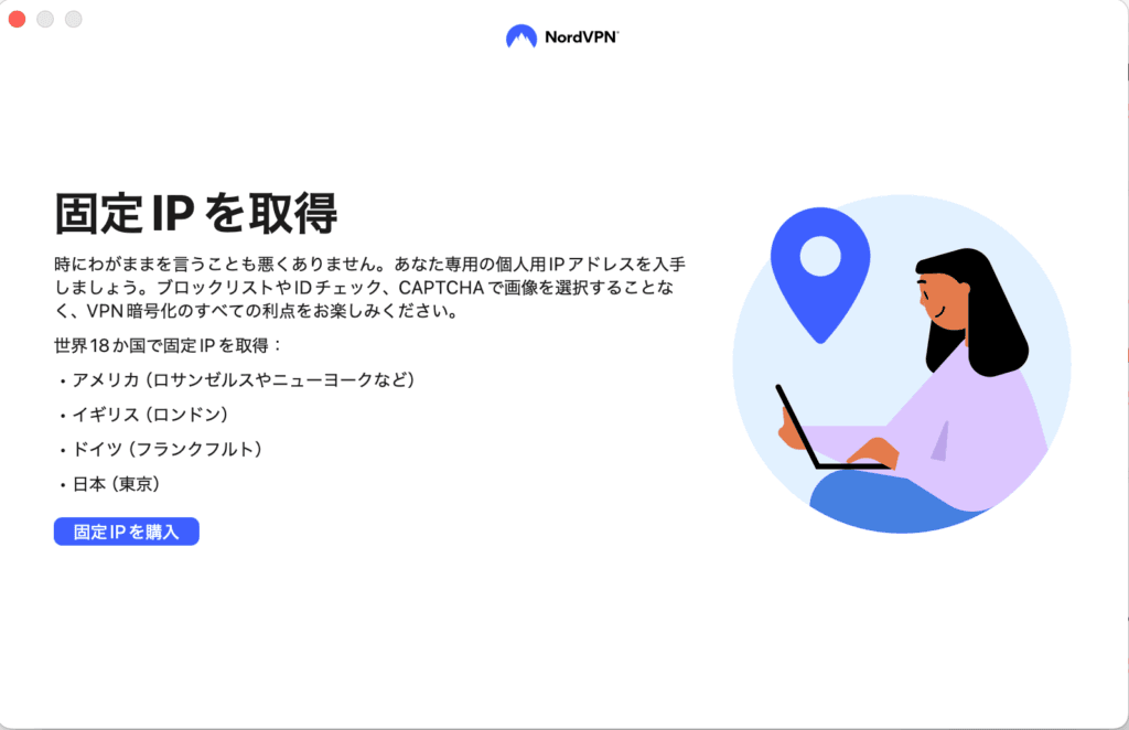 NordVPNは使用するIPアドレスを変化させないようにする、固定IPを提供しているサービスです。
