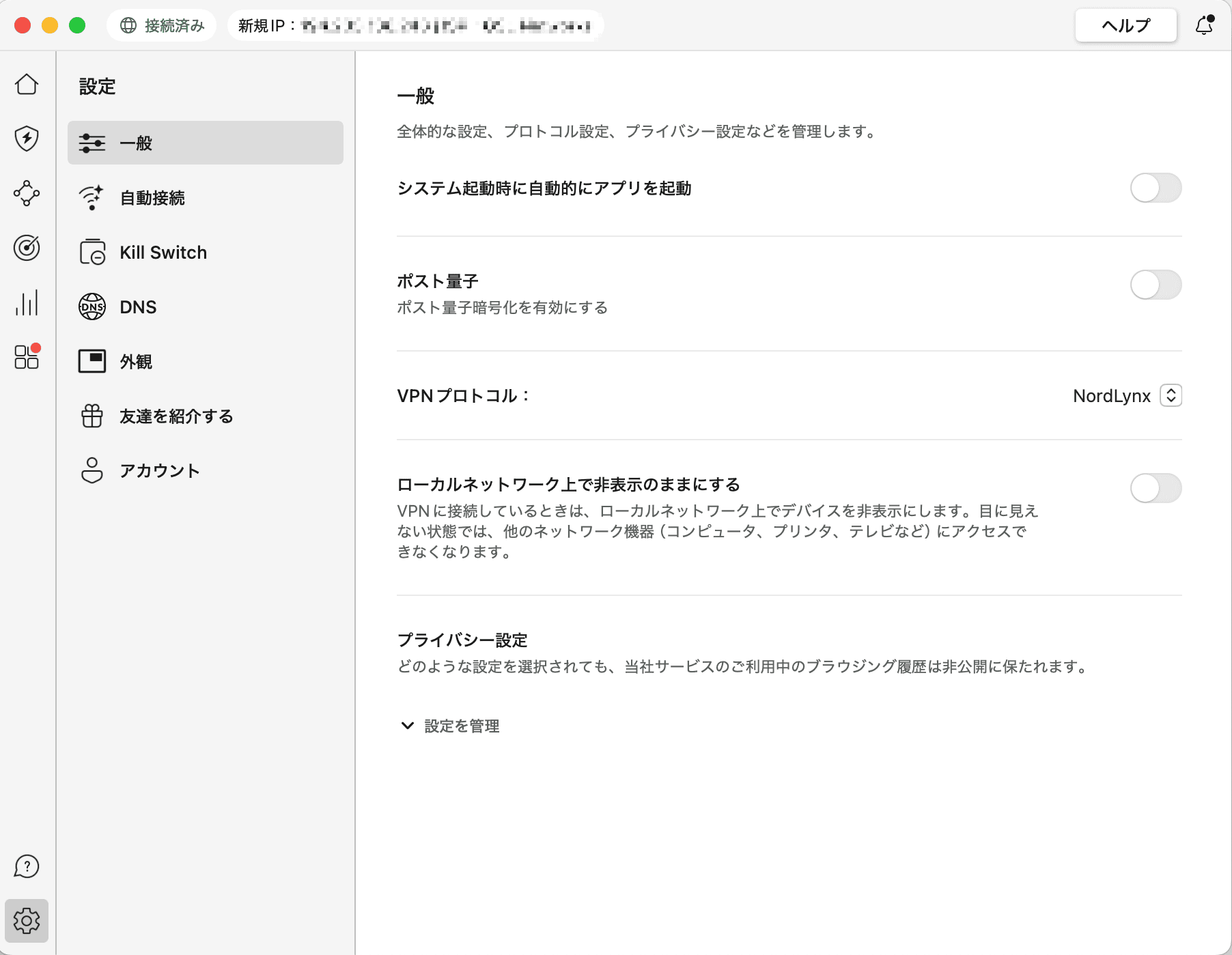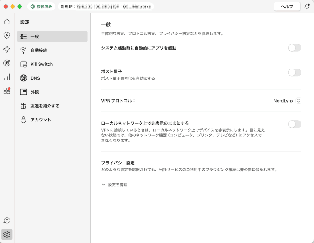 VPN接続が切れたときにネットワークを遮断するキルスイッチの有効・無効化、PCと同時にソフトウェアを起動する自動接続のオンオフなど、セキュリティや利便性を高める機能を搭載しています。