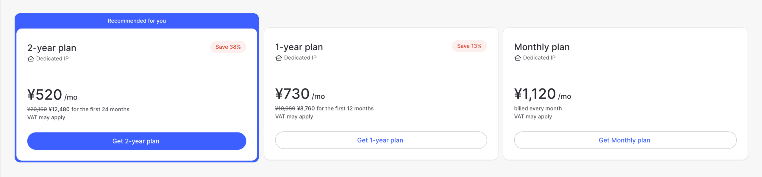 有料ですがそこまで高くない(2年プランで月520円)ので、機密情報を保管しているサーバーにアクセスする場合や金融サービス利用時など、必要に応じて固定IPを利用しましょう。