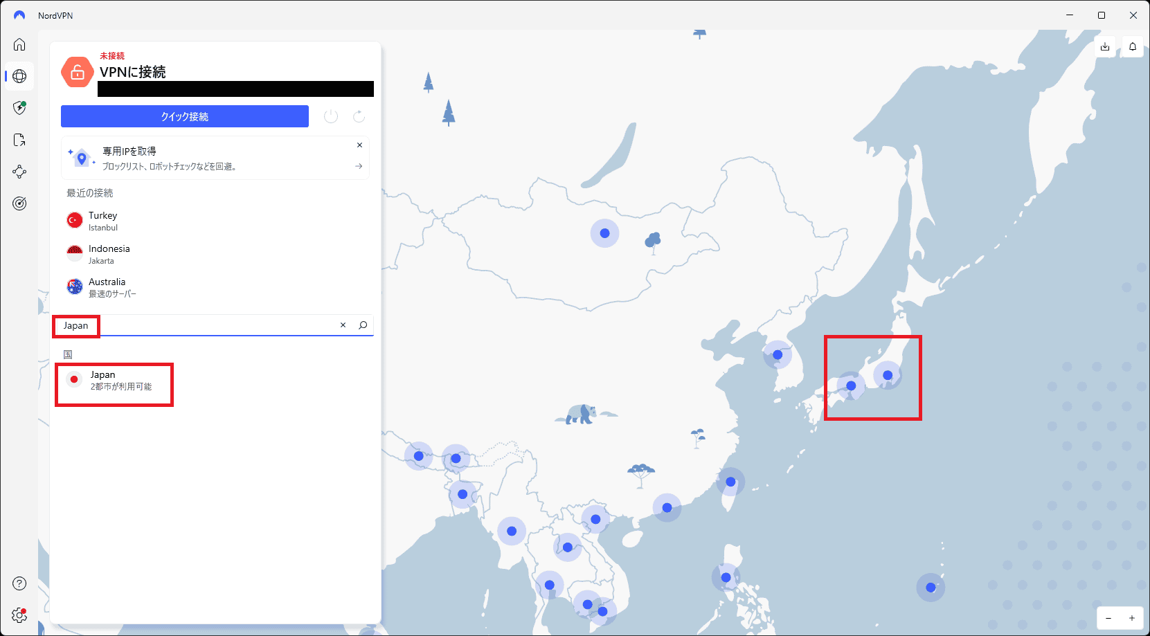 NordVPNのアプリを立ち上げ「Japan」と検索して接続します。
