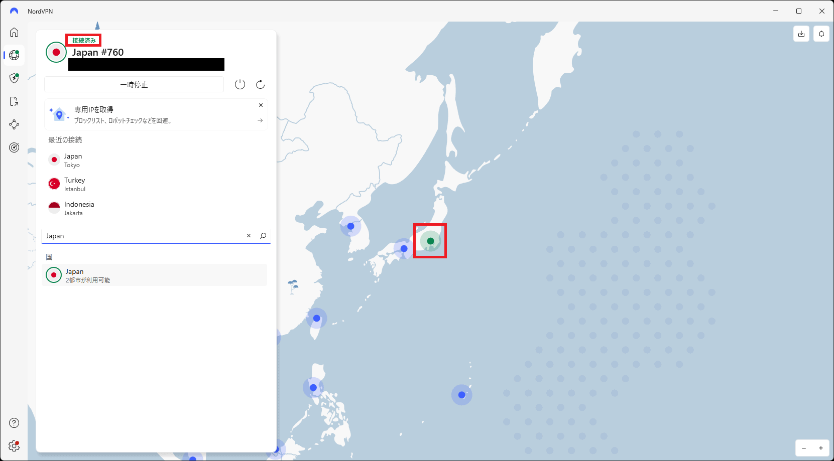 画面上部に「接続済み」が表示され、マップ上で日本国内に緑のピンが立っていれば接続完了です。