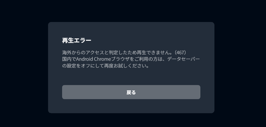U-NEXTに海外からアクセスすると、以下のような画面が表示され、契約中でも動画を再生できません。