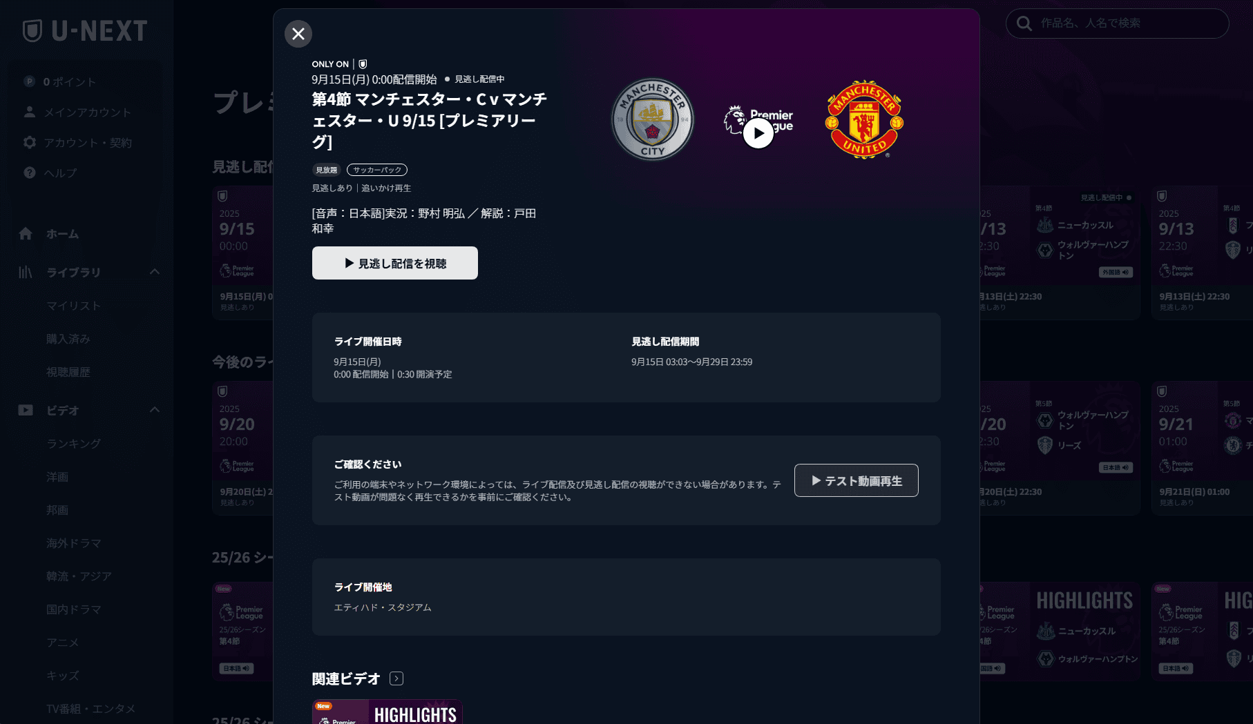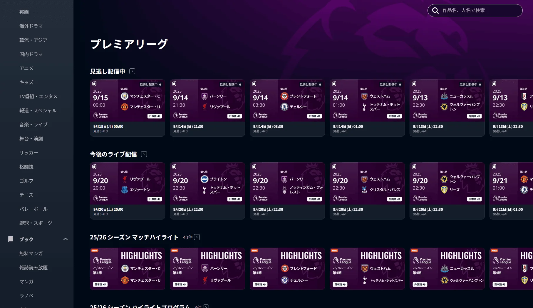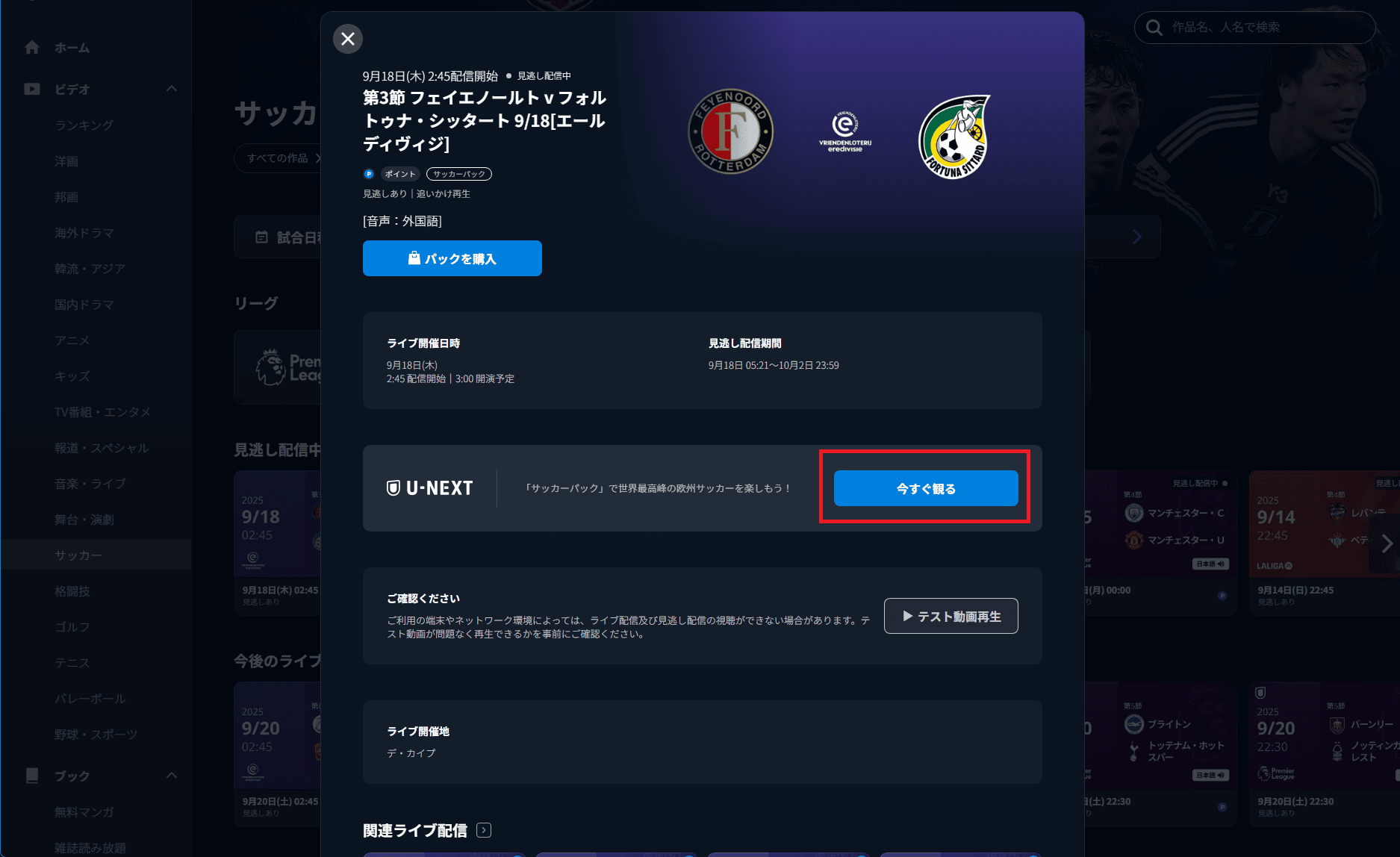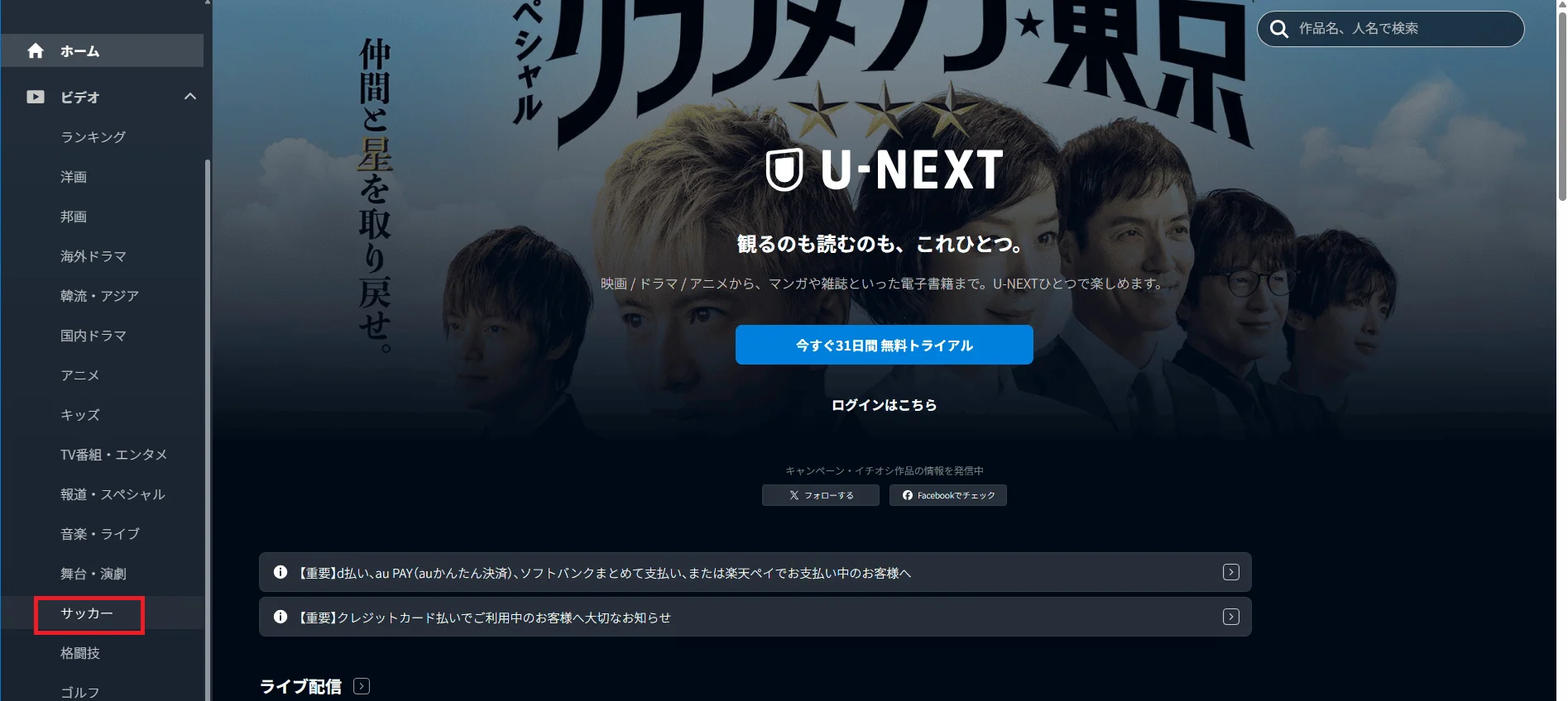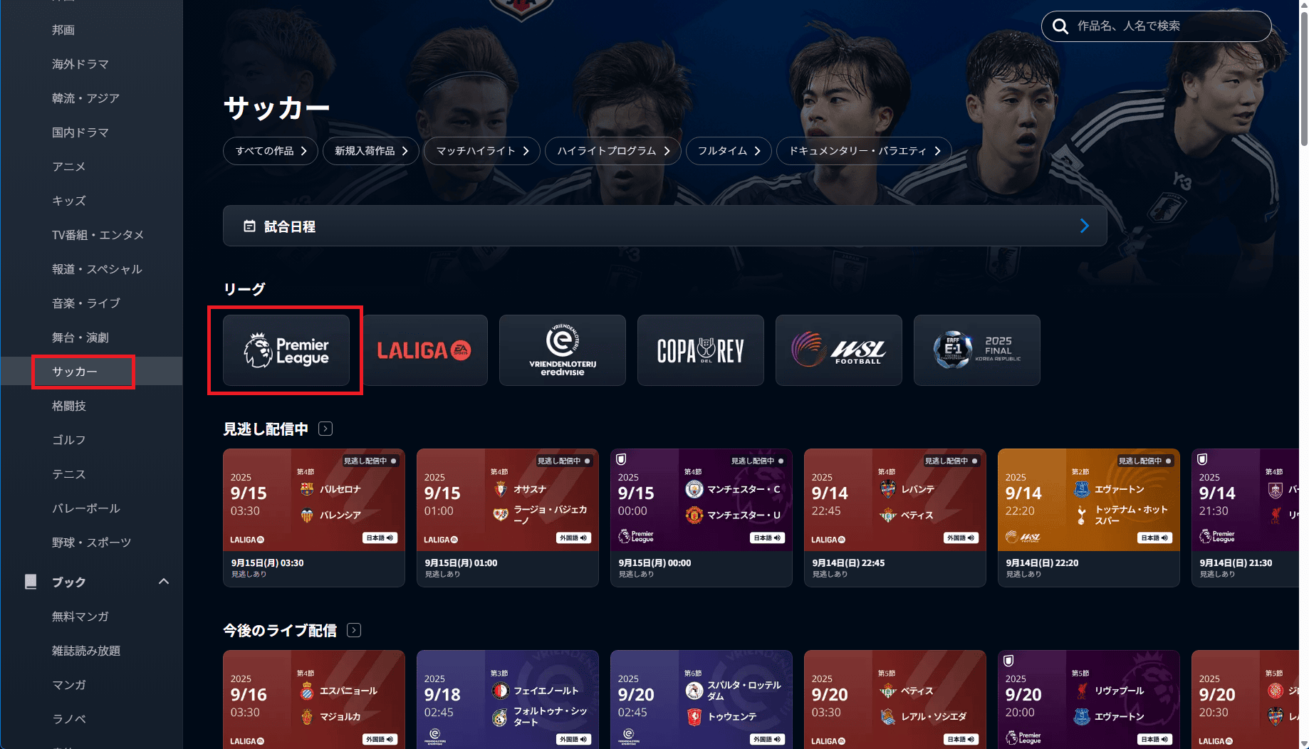 日本サーバーに接続した状態でU-NEXTにアクセスし、プレミアリーグの特集ページに移動します。