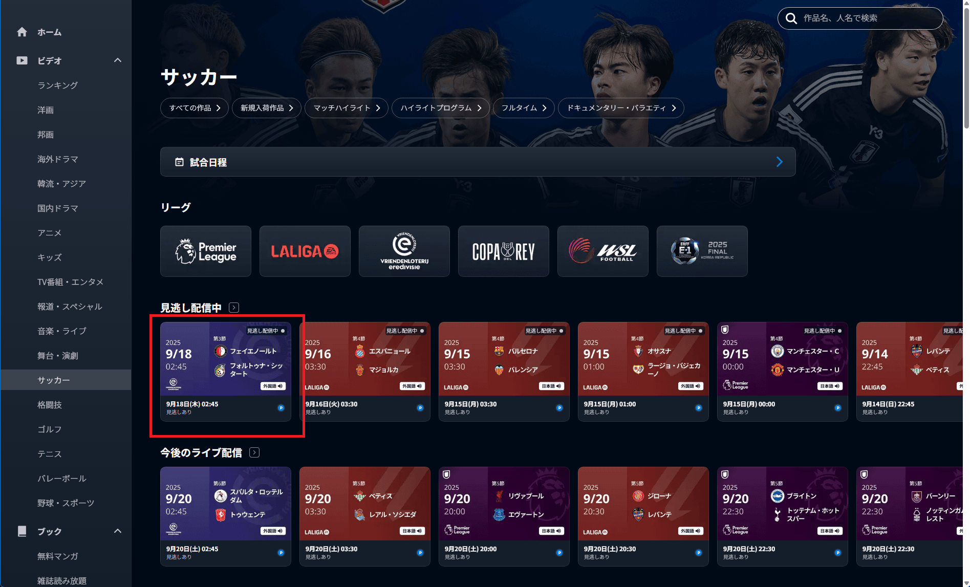 「今週のライブ配信」に直近1週間で予定されている試合が表示されるので、観たい試合の当日に選べばリアルタイムで視聴可能です。
