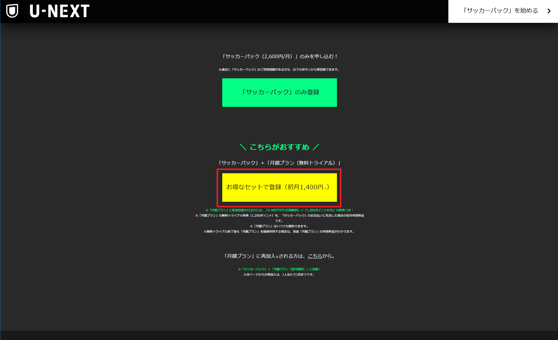 月額プランが初回契約なら無料トライアル期間もつくので、契約初月の料金はサッカーパックの1,400円のみとなり、さらにお得です。
