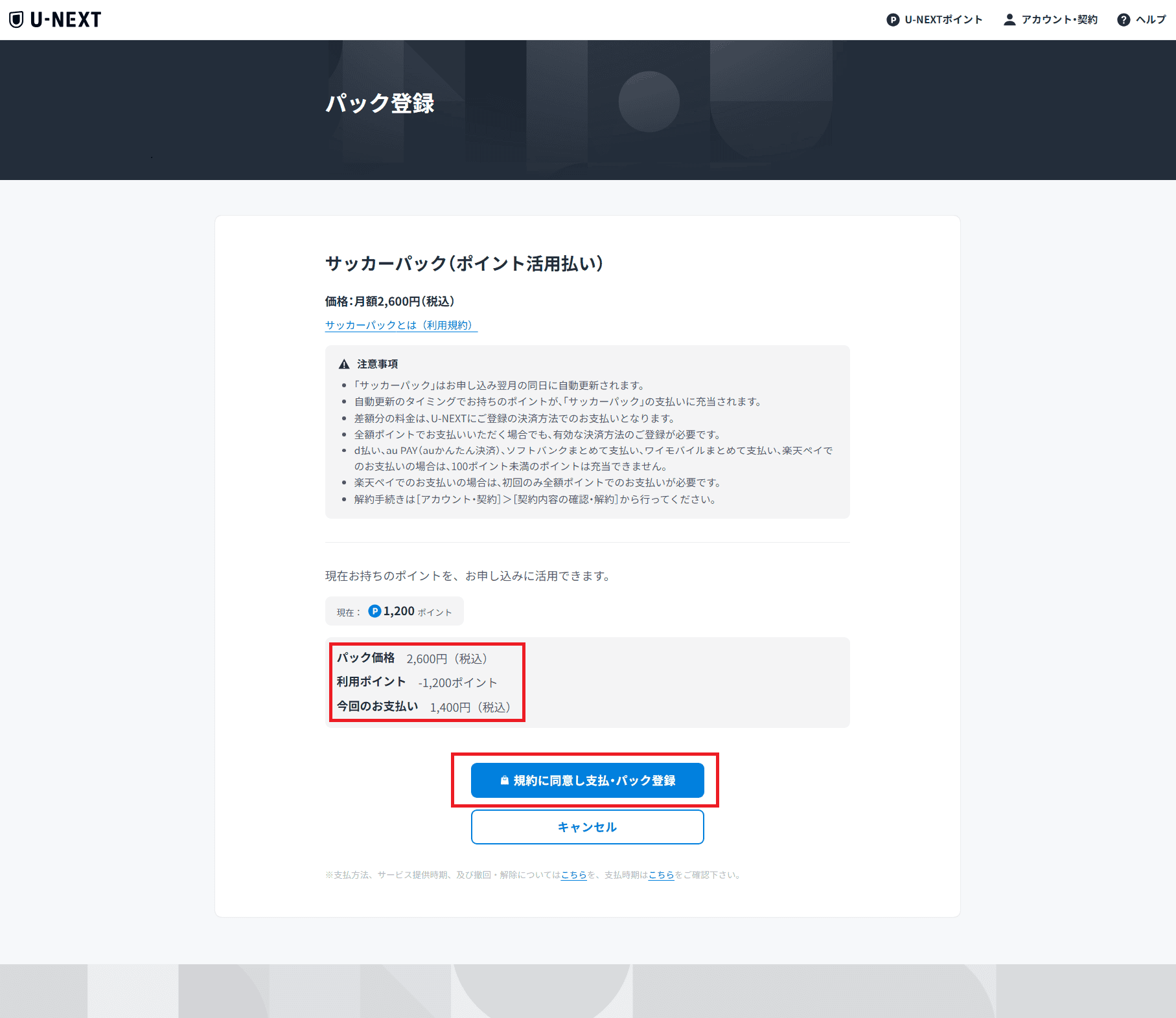 サッカーパック単独でも契約できますが、無料トライアル期間がなく、ポイントも付与されません。