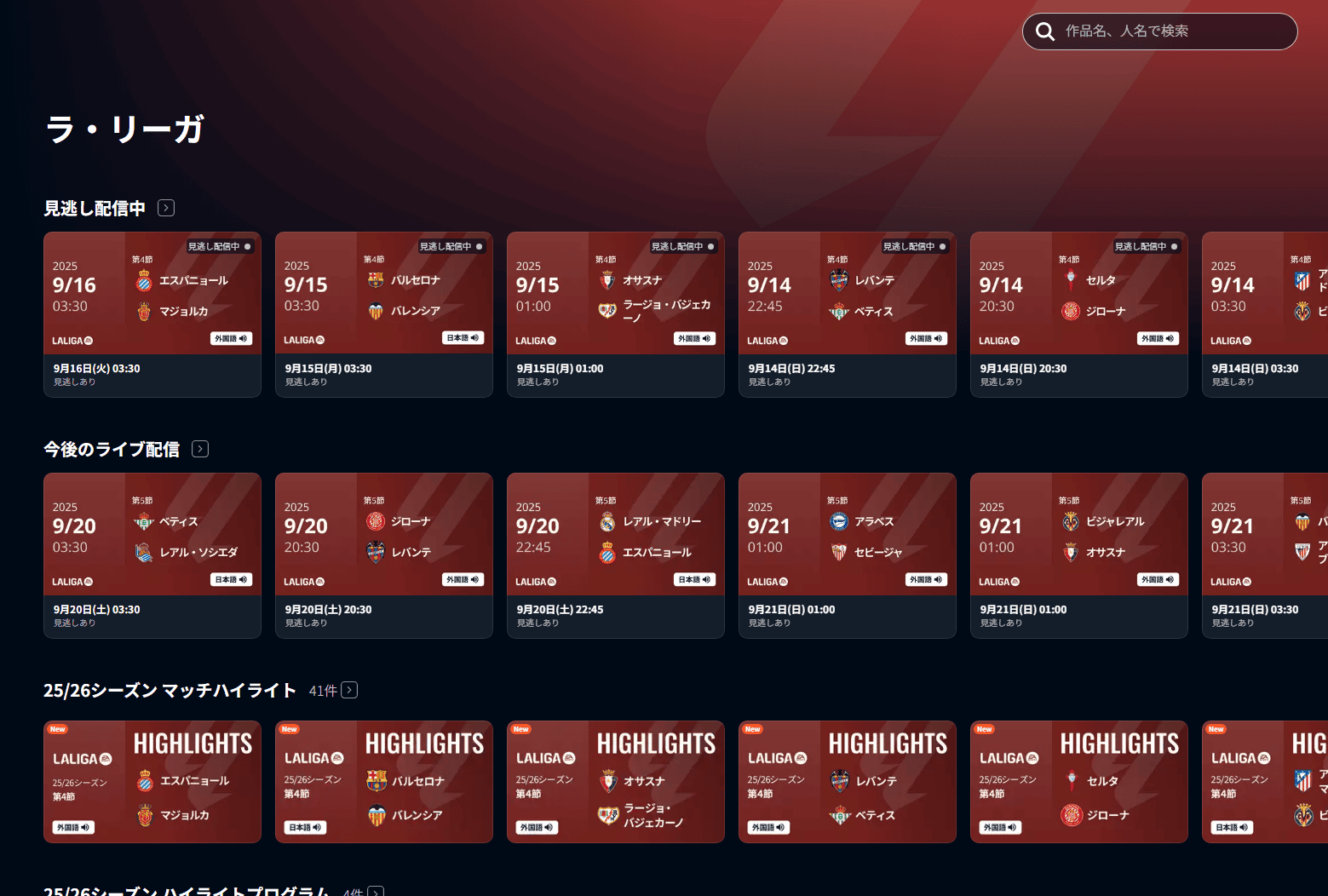 また、世界中のスポーツ配信で有名なDAZNは、スペインで放映権を獲得している一方、日本では2021年のシーズンで契約を終了しているため、視聴できません。