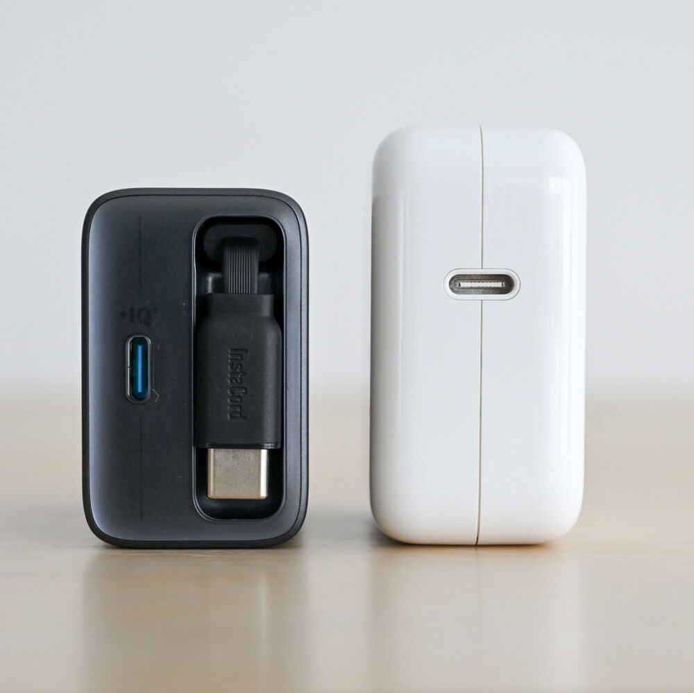 ケーブル内蔵にもかかわらず、Apple 30W USB-C電源アダプタより若干小さく、本機がいかにコンパクトか伺えます。