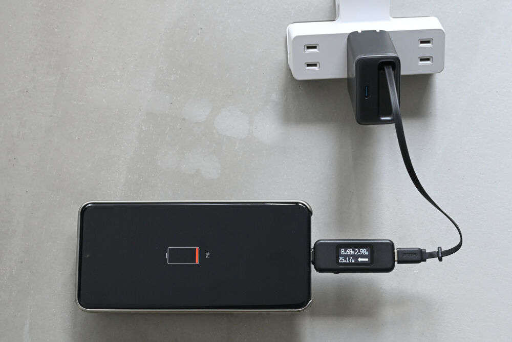 当然スマホの充電も可能かつPPS対応なので、PPS対応のAndroidスマホでは25W以上、iPhoneでも20W以上しっかり出ていました。