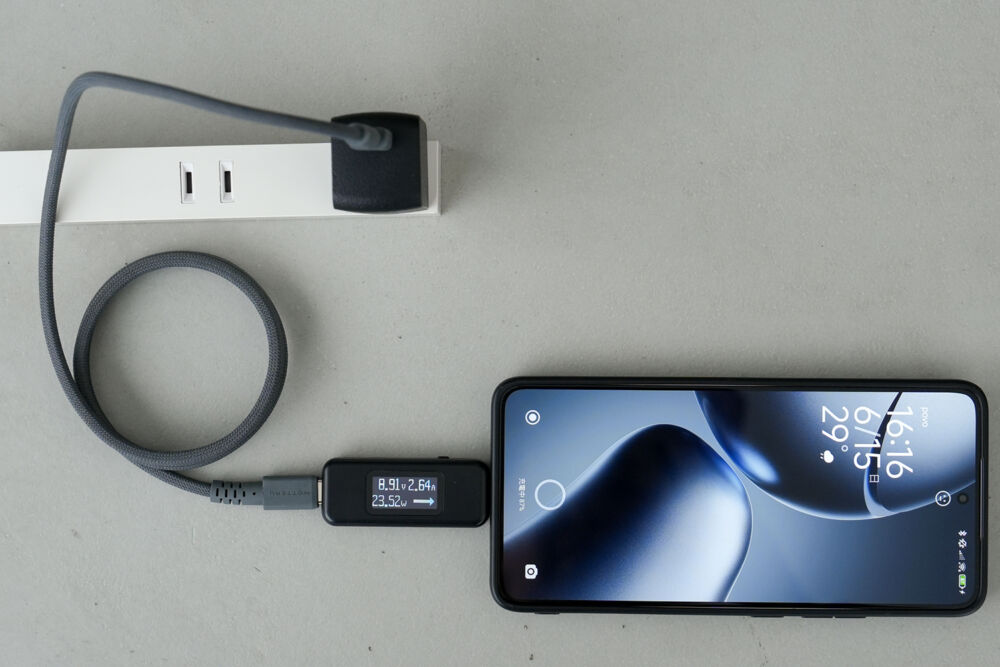 PPS対応スマホのXiaomi 14T Proを充電したところ23W以上を記録し、PPS対応を確認できました。
