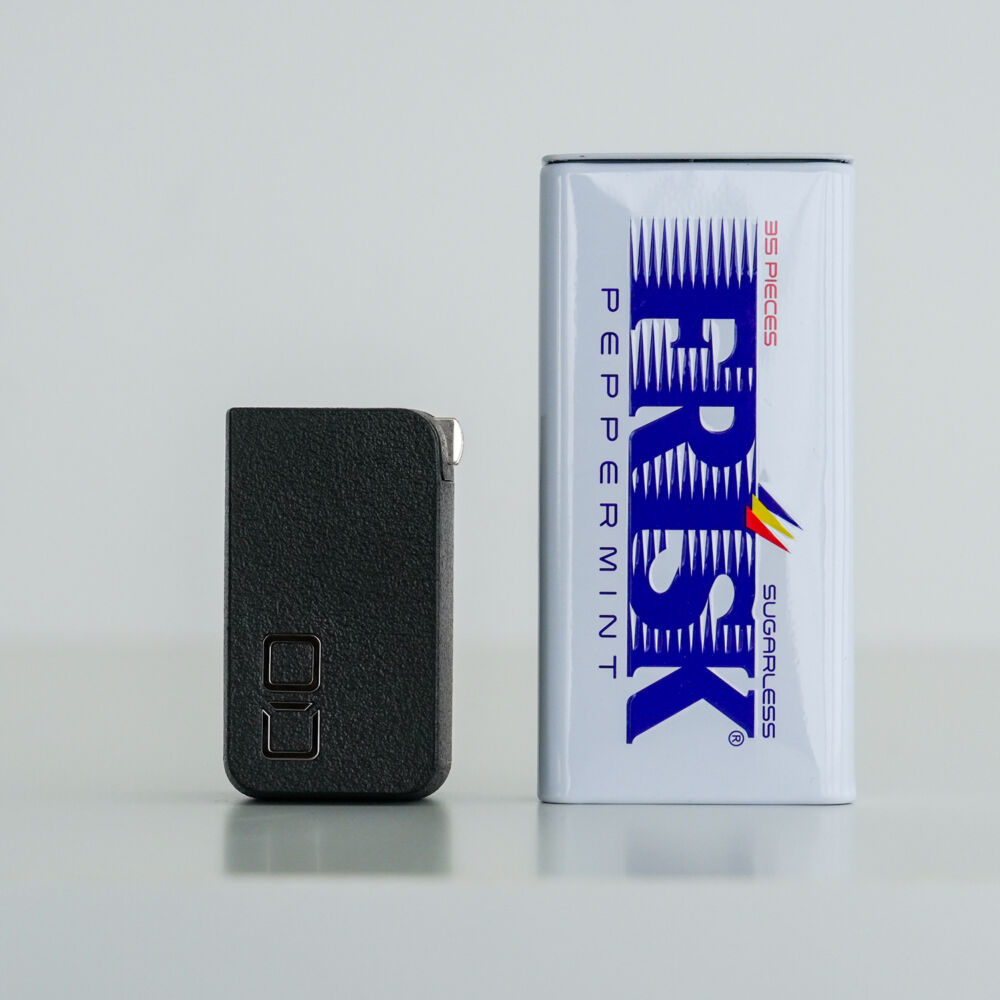 サイズは約52.5 × 30 × 26.5 mmで、Apple 70W USB-C電源アダプタと並べると約3分の1と、とんでもない小型化を実現しています。