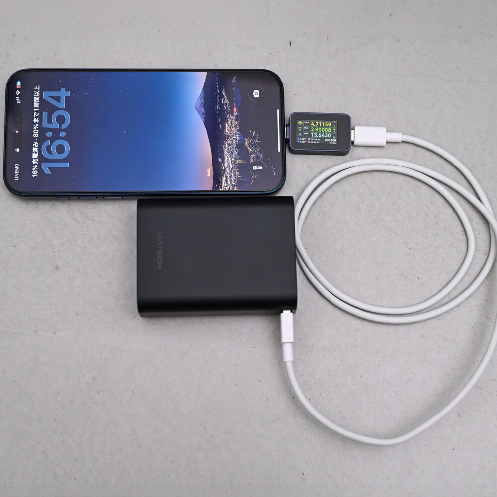 USB-Aポート側では13W程度出るので、一般的なスマホの充電には十分。