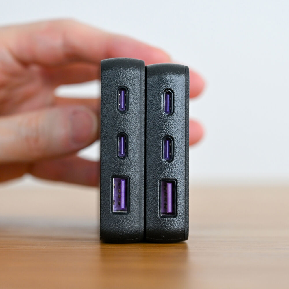 2ポート接続時は合計最大30Wに制限されるので、ノートPC充電は厳しく、スマホの同時充電でなんとかいった感じ。