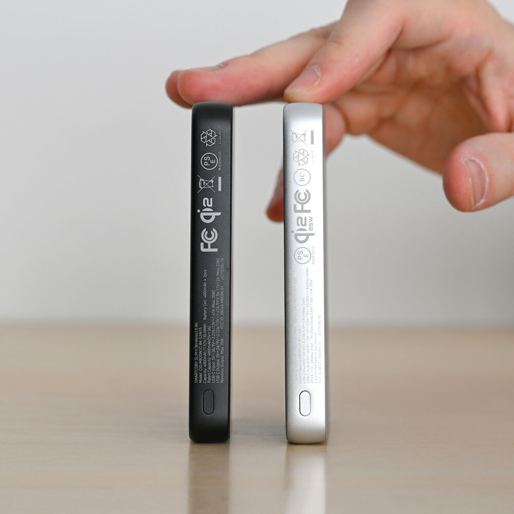 「8,000mAh」というちょうどいいバッテリー容量の恩恵で、10,000mAhバージョンの「SMARTCOBY SLIM II Wireless2.2 Pro 10K」の厚み14.6mmから本機8Kは「12mm」と、かなりの薄型化を実現しています。
